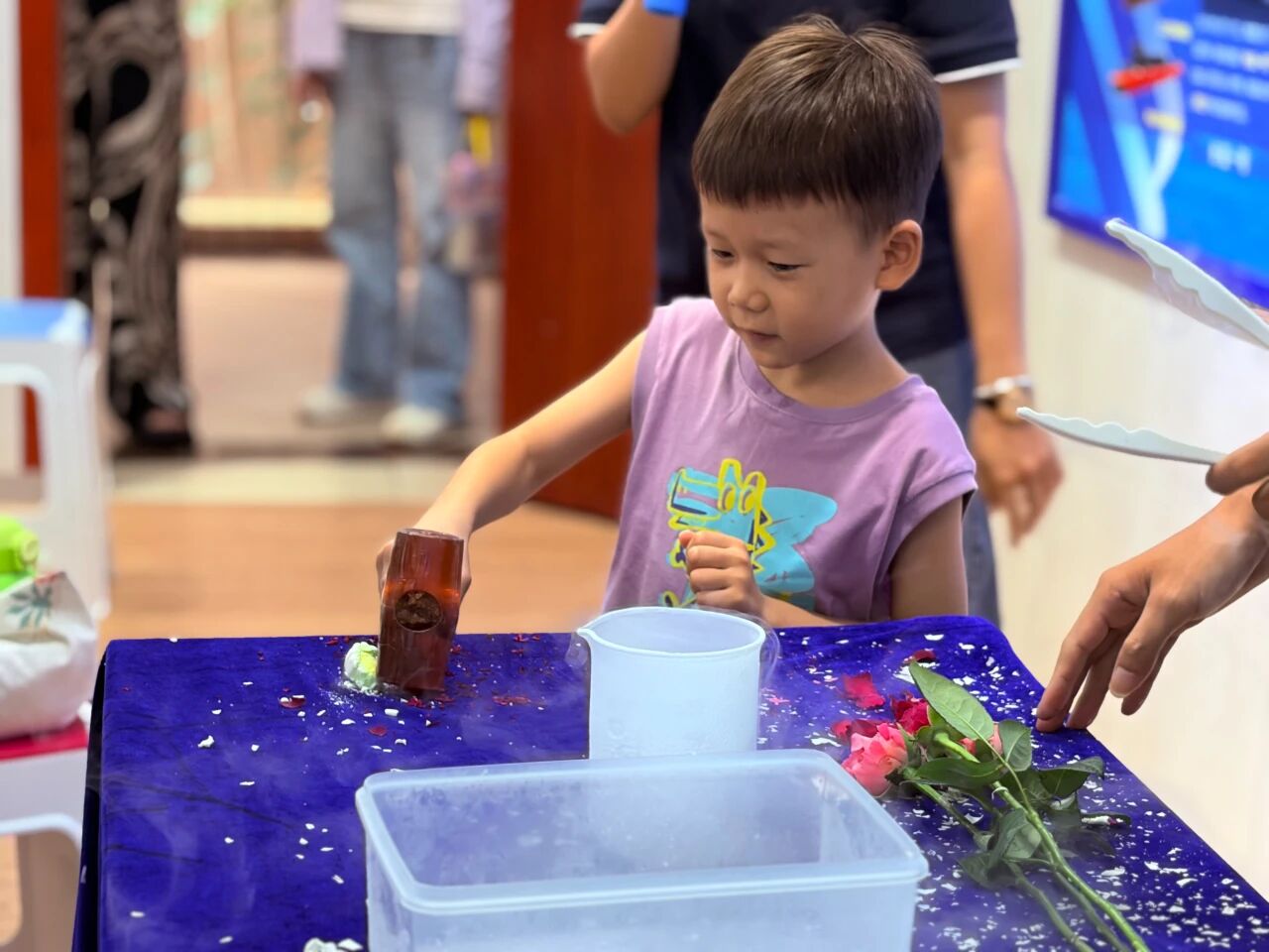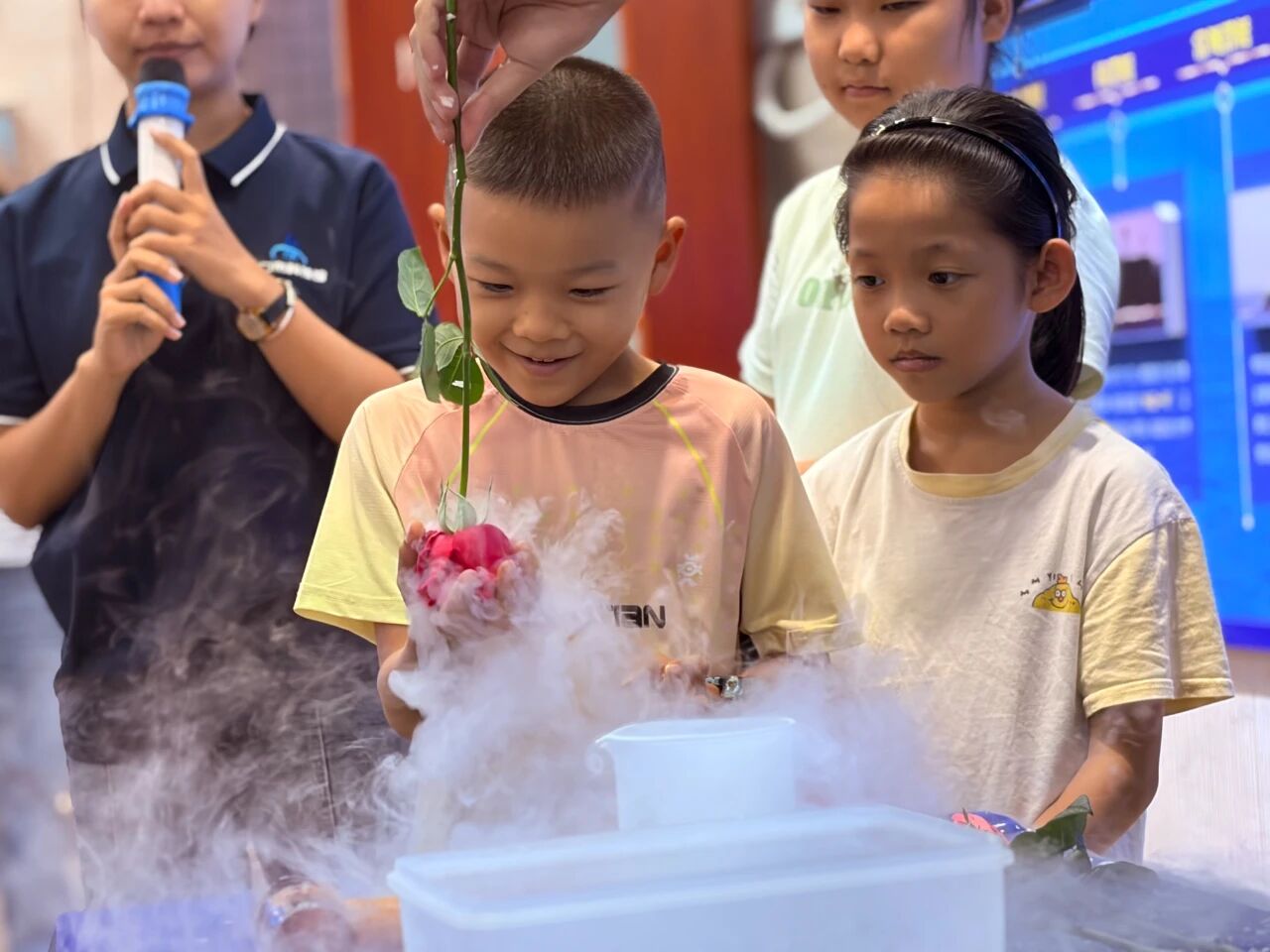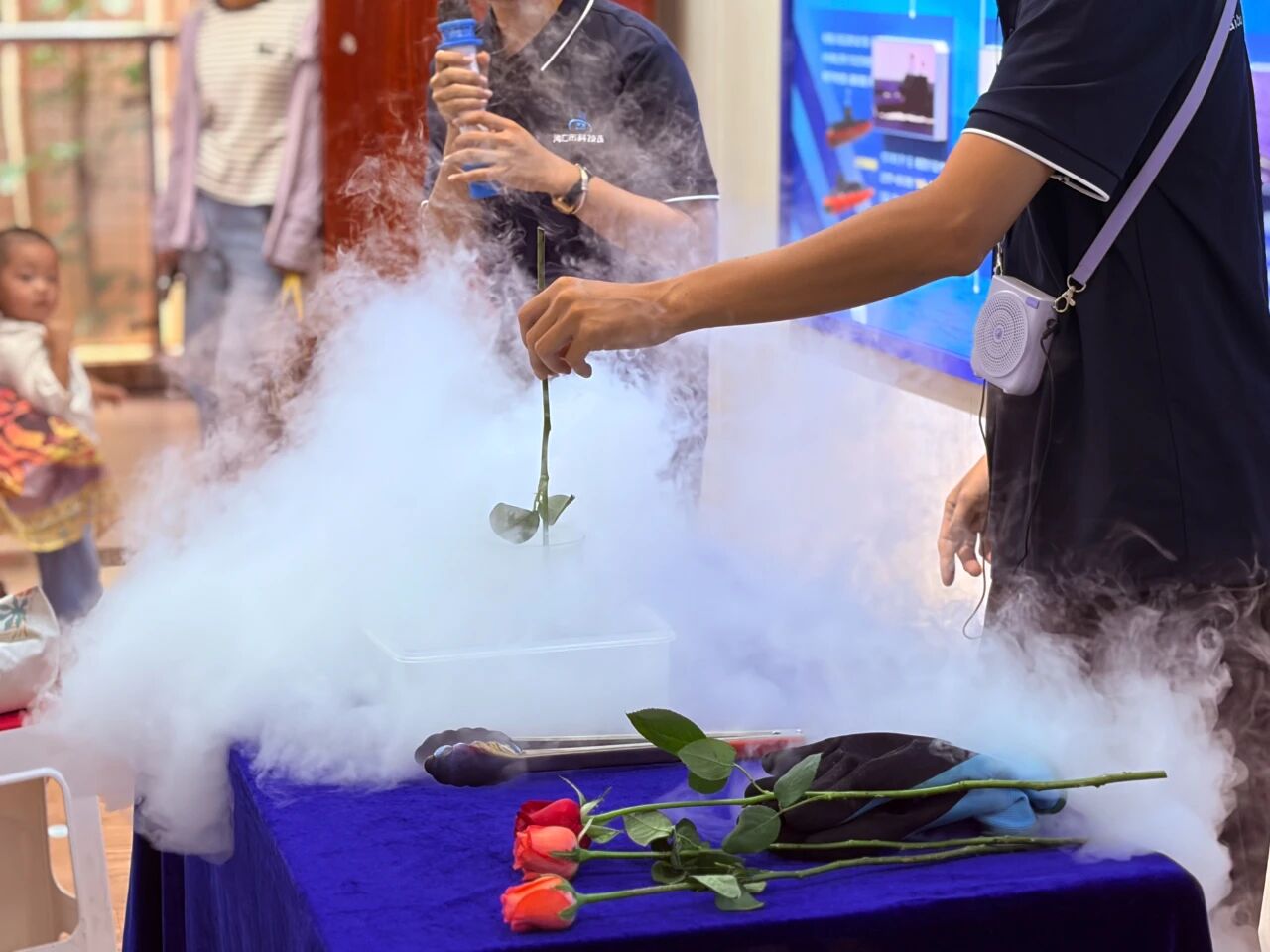 紧接着的“极寒之旅”科学实验秀,将是整场活动的高潮。“吞云吐雾”实验中,当液氮与空气接触,会迅速汽化形成大量白雾,仿佛置身于云雾缭绕的仙境,同学们亲手体验这一过程,感受低温带来的视觉冲击;“仙女散花”实验里,液氮让物质呈现出如同花瓣般的奇妙形态,轻轻一触,这些“花瓣”便会散落,同学们能在这一过程中观察物质在极寒下的物理变化;“神奇百宝箱”更是充满惊喜,桶里的气球在液氮的作用下会发生意想不到的改变,气球会瞬间“瘪掉”又在常温下“复活”,鲜花被“冻住时间”却依旧保持美丽,每一次从百宝箱中取出物品进行实验,都像是在开启一个科学盲盒,充满未知与趣味;“云雾喷泉”实验则会展示液氮与液体碰撞时产生的壮观景象,强劲的“云雾喷泉”迸发而出,可以清晰地看到力与低温的化学反应,理解其中蕴含的科学原理。